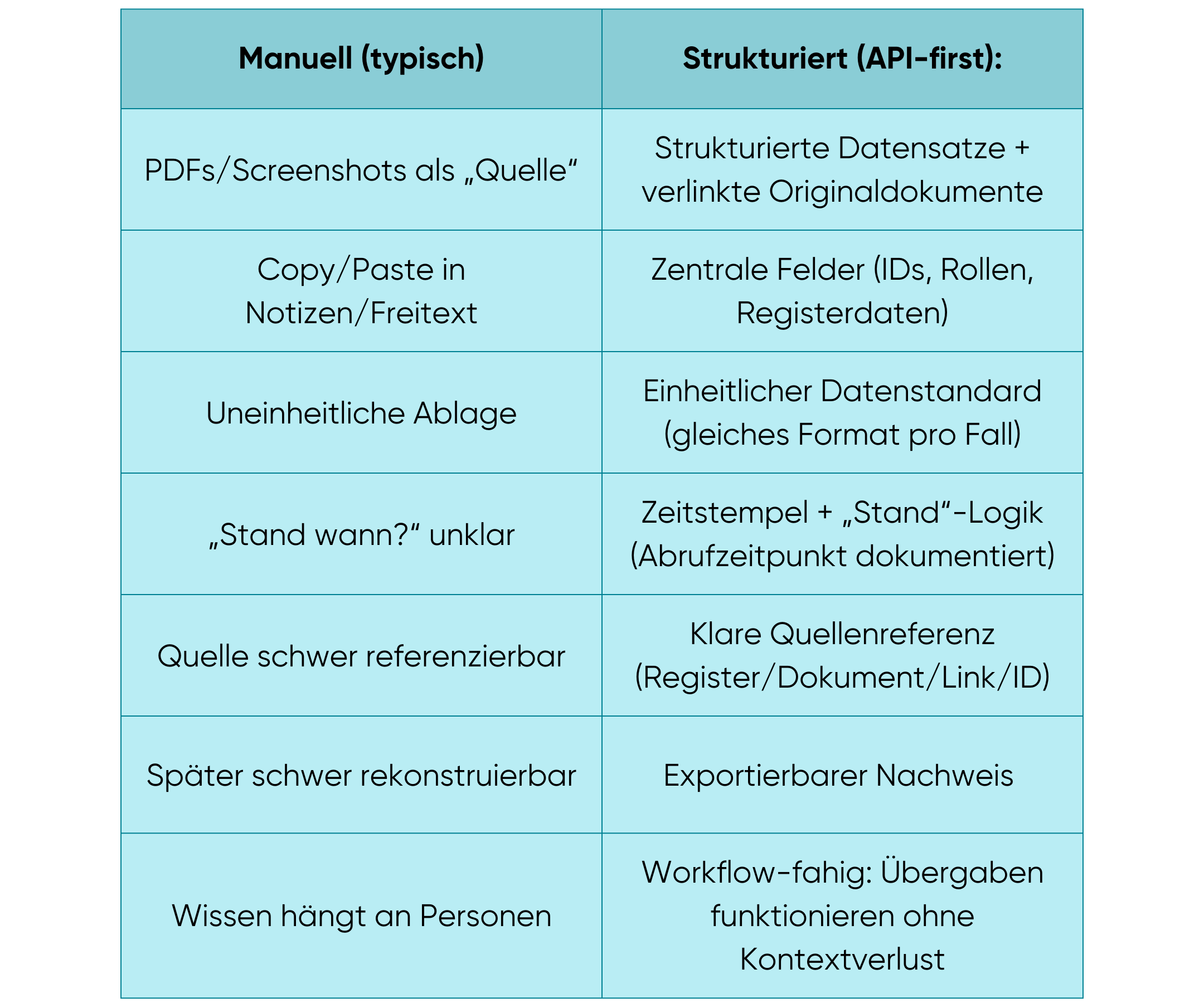 Wenn diese Daten nur als PDF oder „im Browser“ vorliegen, sind sie schwer systematisch weiterzuverwenden. Eine API macht den Unterschied, weil sie Registerdaten als Felder bereitstellt – also so, dass sie sich direkt in CRM-, DMS- oder Case-Management-Workflows einbauen lassen.